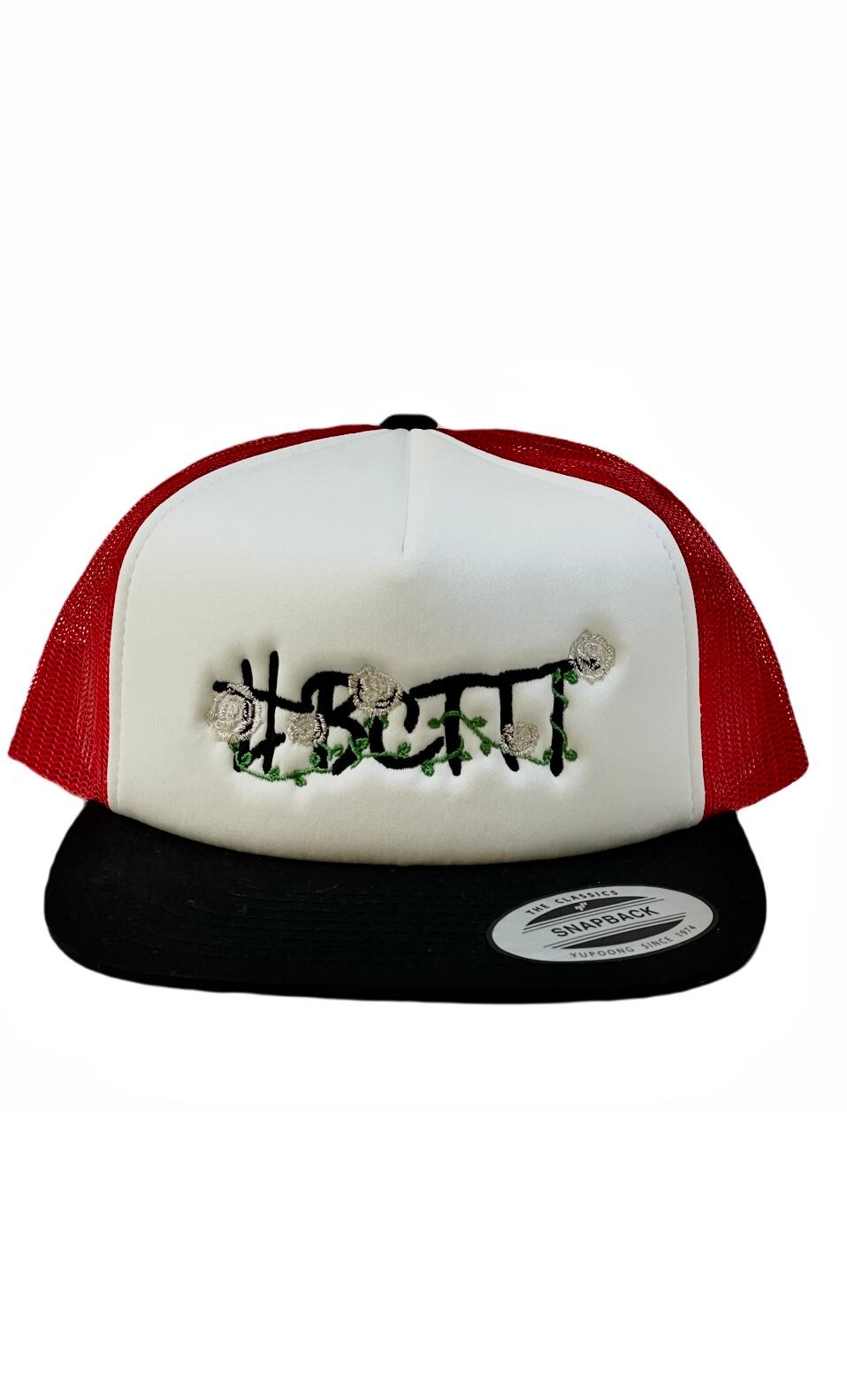 メッシュキャップに贅沢に#BCTTT と シルバーのバラを刺繍した一品。